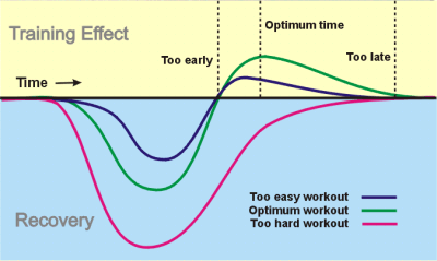The general idea of training is to challenge the body and then allow it sufficient rest to repair and come back stronger. Regular training can thereby make the body better and better. If not enough rest is allowed or the challenge is too demanding, the body will not be able to repair properly and thereby not improve, and instead show signs of injury (over-training). When the training does not challenge the body or if the rest is far too long, there are no improvements (under-training).